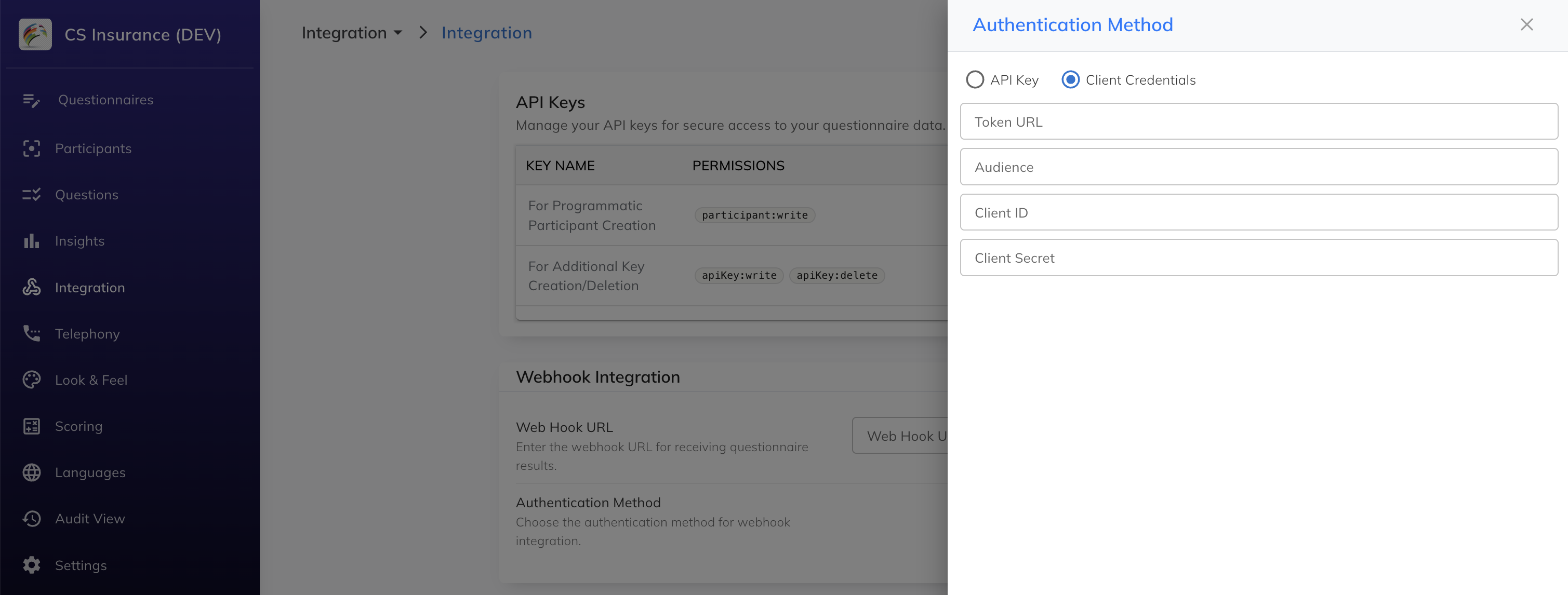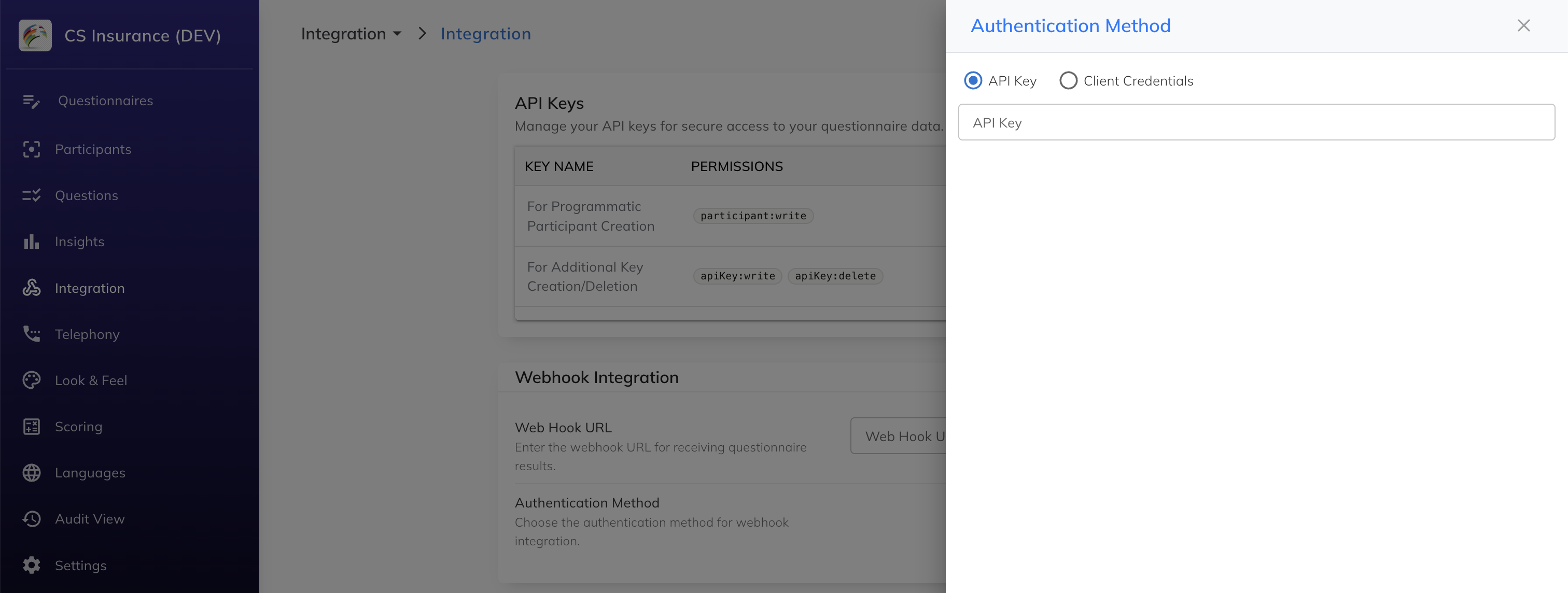 - In the questionnaire-specific left navigation bar, click Integration.