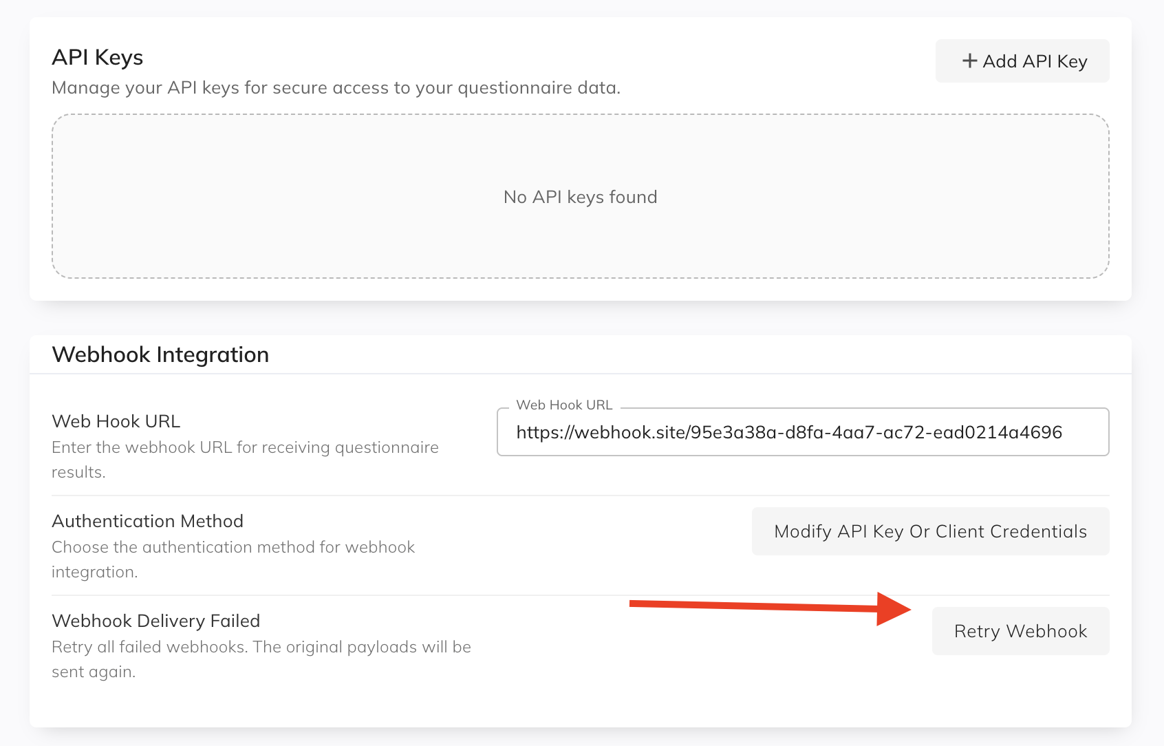 If a webhook delivery fails (non-200 response or timeout), the original payload is stored. A Retry Webhook button appears in the Webhook Delivery Failed row on the Integration page — but only when there are failures from the past 15 days. If no recent failures exist, this row is not shown.