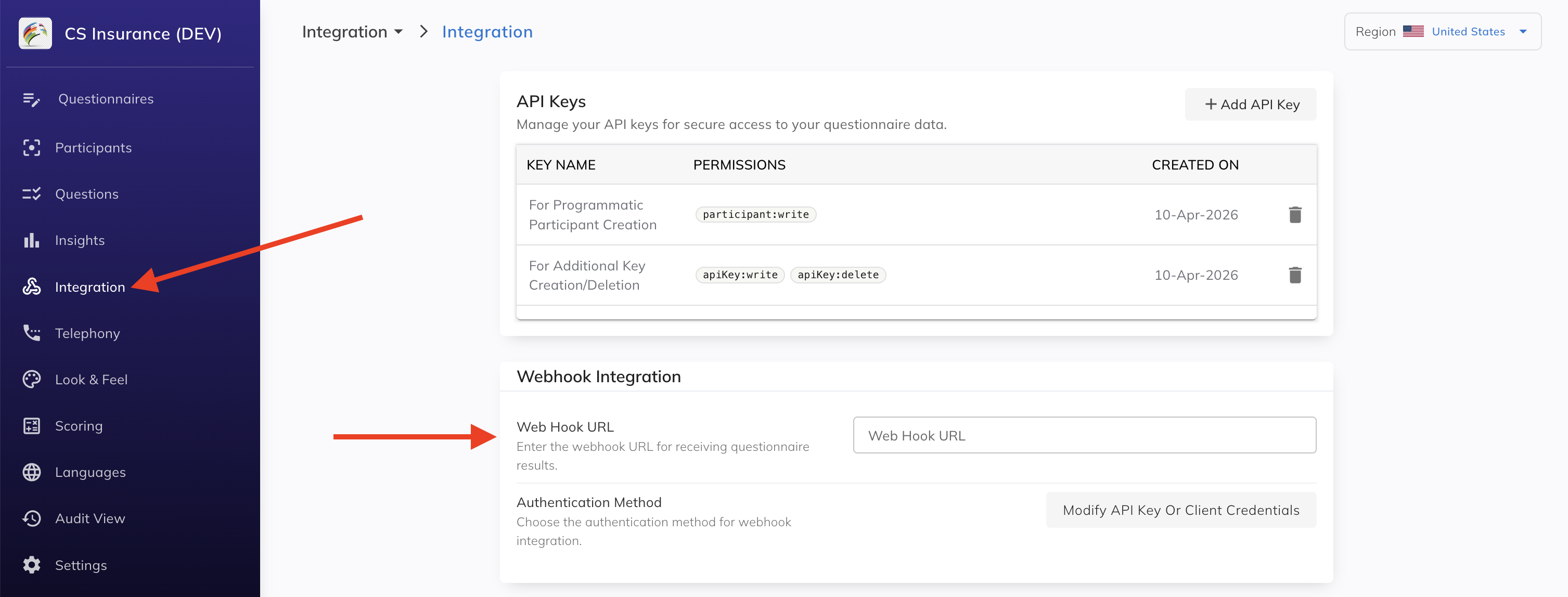 - In the Webhook Integration section, enter your endpoint URL in the Web Hook URL field.